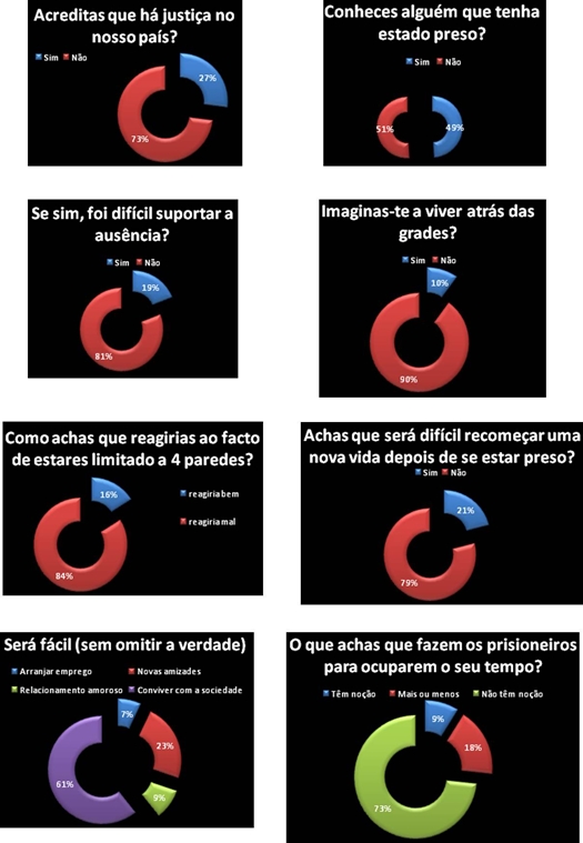 Os dados apresentados em cima são dos inquéritos aos alunos do ensino superior das turmas de Ciências e Tecnologias bem como de Humanidades. Este inquérito teve como principal objectivo perceber o que pensam os alunos sobre o dia-a-dia de um prisioneiro mas também fazer os alunos pensar sobre o que sentiriam se estivessem no papel dos reclusos. Após a análise do inquérito pudemos constatar que em relação à primeira pergunta que questiona a existência de justiça no nosso país, a resposta foi maioritariamente “não” em ambos os sexos. Na segunda questão prevaleceu novamente o “não” em ambos os sexos tal como na pergunta relacionada com essa, uma vez que muitos alunos não conheciam ninguém que tivesses estado preso. Quando questionámos os estudantes sobre se imaginavam a viver atrás das grades, mais uma vez as respostas em ambos os sexos foi “não” na maioria. Em relação aos sentimentos que lhes iam invadir após serem presos, tanto os rapazes como as raparigas evidenciaram que reagiriam mal e acharam que entrariam em estado de loucura e depressão. As respostas dos alunos que referiram que reagiriam bem foram principalmente fundamentadas pelo facto de merecerem estar na prisão e, consequencialmente, merecerem o sofrimento passado. Em relação à vida depois da prisão, não houve unanimidade nos sexos. Os rapazes acharam que seria fácil a integração na sociedade, a criação de novas amizades e relacionamentos amorosos bem como arranjar emprego. Já as raparigas acham que todas as opções seriam difíceis. A sétima questão, sobre a ocupação do dia-a-dia dos prisioneiros foi a mais interessante de analisar, pois muitos dos alunos revelaram não ter qualquer noção de como é viver atrás das grades. Muitos pensam que os reclusos passam 24h sobre 24h fechados na cela, o que revela ser ridículo. No entanto, houve alguns alunos que mostraram ter algum conhecimento sobre a ocupação do tempo livre. Guião do Retrato de uma vida Prisional Melânia - psicóloga Mónica - filha Íris - prisioneira Micaela - prisioneira João (irmão da Melânia) - filho 1ºCena > Micaela já está presa, Íris é empurrada lá para dentro e Micaela olha-a de cima abaixo e faz má cara. Íris está assustada e pergunta qual é a sua cama. De seguida as duas reclusas falam sobre as penas que estão a cumprir, Íris diz-se inocente, vítima de uma confusão que a levou para a prisão. Micaela ri-se na sua cara e diz-lhe que ninguém está ali por ser santinho e dá-lhe uma chapada nas costas. Micaela explica brevemente como são as coisas lá dentro, sempre com um tom agressivo. Íris sai da cela e vai falar com a psicóloga. 2ºCena > Melânia está sentada e Íris chega. I - Os meus filhos? M - Maria não se preocupe, os seus filhos estão a cargo dos avós não se preocupe. I - Mas eu não fiz nada, tire-me daqui. M - Tenha calma, com o tempo tudo se irá resolver. I - Isto é horrível, a minha companheira trata-me mal eu não quero estar aqui! Eu não mereço isto! Ajude-me por favor, eu não consigo estar longe dos meus filhos! M - Tenha calma Maria, estou aqui para a ajudar. (segunda conversa com a psicóloga) M - Então Maria, como se sente hoje? I - Sinto-me mal, é muito difícil estar longe dos meus filhos, não os ver crescer e vê-los sofrer por esta injustiça. Diga-me, para quando é o julgamento? M - Está para breve, em princípio será na próxima semana. O seu advogado vai defendê-la, tem de ter calma e esperança Maria. I - Obrigada por tudo, você tem sido um grande e o meu único apoio. 3ºCena > Íris está ansiosa porque vai ter a primeira visita dos seus familiares. Micaela diz que já não recebe visitas há mais de um ano, pois não quer ver ninguém da sua família. Assim que Íris sai, Micaela pensa alto dizendo que é a única que não recebe visitas. 4ºCena > Íris recebe a visitas dos dois filhos e, emocionada, diz que tem saudades e chora, explica que vai começar um curso na prisão, mas afirma sempre a sua inocência e que vai fazer de tudo para sair em liberdade o mais rápido possível. 5ºCena > Melânia fala com os filhos da Maria. Fº - Tire a minha mãe daqui, eu quero a minha mãe. Fª - Tem calma mano, a mãe não fez nada ela tem de sair! M - A tua irmã tem razão querido, a tua mãe vai sair só temos de esperar um pouco. E vocês sabem que algo que precisem eu estou aqui. E a escola, meninos, como vai? Fª - Tenho descido muito as notas, não me consigo concentrar. M - Tens de te esforçar, é difícil, mas tudo vai passar. 6ºCena > Íris, após o julgamento, sai em liberdade. Ocorre a união de toda a família. Locais de filmagem > Sala 22 do Externato Dom Fuas Roupinho