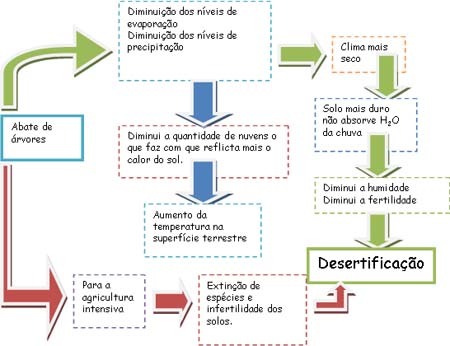 As reduções acordadas no protocolo de Quioto incidiam sobre: - Dióxido de carbono (CO2) - Metano (CH4) - Óxido nitroso (N2O) - Hidrofluorcarbonetos (HFCs) - Hidrocarbonetos perfluorados (PFCs) - Hexafluoreto de enxofre(SF6) Os níveis de referência adoptados foram os de 1990 e as reduções representavam, em média, 5%; a União Europeia, negociando em bloco, comprometia-se a uma redução de 8%. No Protocolo de Quioto, uma forma inteiramente inovadora é preconizada para promover uma redução significativa dos GEE – as transacções comerciais entre países - sob três formas: comércio de emissões, implementação conjunta e mecanismos de desenvolvimento limpo, este último só para depois de 2008. O princípio é apostar numa redução que seja economicamente vantajosa, pois desta forma será mais efectiva e realista. A implementação do Protocolo ficou condicionada à ratificação por 55 países que detivessem em conjunto 55% da cota de emissões globais. Na prática, os EUA, que nesta matéria defendiam posições muito diferentes das da UE, ficaram com o poder de voto. Desflorestação O que é? O processo de Desflorestação consiste na remoção, em larga escala, de grandes porções de floresta, anterior à sua substituição por outras utilizações do solo. Em bom português se pode descrever como o abate de árvores com vista a utilizar o solo por elas ocupado para outros fins, economicamente mais rentáveis do que ter um conjunto de seres vivos que controlam os ciclos de água do solo e a reciclagem do ar, com produção de oxigénio. É devido a esta forma materialista de pensar que a Desflorestação foi durante muitos anos vista como impulsionadora do desenvolvimento da economia de um país, visto que com ela se liquida o "capital" de uma floresta, abrindo caminho para outras formas de lucro, como a produção de comida, matéria-prima, energia ou construção de infra-estruturas. Segundo as estatísticas, 17 milhões de hectares (170000km² - uma área superior à da Inglaterra, País de Gales e Irlanda do Norte, quando combinada) de floresta são destruídos anualmente. A Desflorestação deve ser distinguida da degradação florestal, que consiste na redução da qualidade das florestas, que se lhe encontra associada. Juntas, têm resultados devastadores: erosão dos solos e destabilização das bacias hidrográficas, resultando em secas e inundações. A Desflorestação das florestas tropicais resulta também na redução da biodiversidade e, visto que as florestas desempenham um importante papel na remoção do Dióxido de Carbono, a Desflorestação resulta ainda no aumento do efeito de estufa. Modos de Desflorestação . A Desflorestação por abate e queima (slash & burn); . A desflorestação para colheita de madeira; . A "libertação" dos solos para agricultura instalada; . A "libertação" para plantação de florestas mais produtivas; . O desimpedimento para pastagens; . O abate para madeira combustível (carvão vegetal); . O desimpedimento de vastas áreas para colonização, mineração e exploração de óleo; . O desimpedimento de áreas para construção de estradas e barragens. Algumas das consequências da desflorestação . Redução da biodiversidade . Desaparecimento de culturas . Infertilidade do solo . Redução dos níveis de evaporaçãoàDiminuição da taxa de pluviosidadeà Secura e esterilidade dos solosàDESERTIFICAÇÃO . Descontrolo do clima . Diminuição de oxigénio; aumento de dióxido de carbono