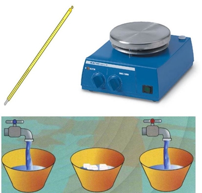 Material: 1 - Uma tina com água quente (45ºC) 2 - Uma tina com água fria (10ºC) 3 - Outra tina com água normal 4 - Dois termómetros. Natureza: ___ ; Alcance: ____ 5 - Placa de aquecimento