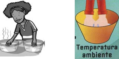 Procedimento experimental: 1º - Encheram-se as tinas com água quente, fria e normal e de preferência com volume igual. 2º - De seguida, mergulhou-se durante 1 minuto, uma das mãos na água quente e a outra na água fira. Regista-se o que se sente. (imagem 1) 3º - Tirou-se rapidamente as mãos de onde estavam e colocou-se noutra tina a uma temperatura ambiente. (imagem 2) 4º - Com o auxílio dos termómetros, determinou-se a temperatura das três águas. (imagem 3)