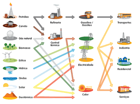 O que é a Energia? A palavra ENERGIA deriva do vocábulo grego «ENERGEIA», que hoje podemos definir como capacidade de produzir trabalho. Esta palavra surge sempre associada à capacidade de poder fazer qualquer coisa acontecer. Tudo o que acontece à nossa volta é provocado pela energia. Utilizamos energia para todos os trabalhos que fazemos, ou mesmo nos momentos de diversão e de descanso. A energia ilumina as nossas cidades, abastece os carros, comboios, aviões, etc. Aquece as nossas casas e a comida, permite-nos ouvir música e ver televisão, põe a funcionar tudo e todos à nossa volta… Quando comemos os nossos corpos transformam os alimentos em energia. Esta é usada para trabalhar, brincar, correr, estudar, ler e em todas as outras actividades que exercemos. Por mais diferentes que sejam as actividades que fazemos, todas têm uma coisa em comum: necessitam de energia para acontecerem! Fontes de Energia As fontes de energia podem classificar-se em: Fontes de energia primárias: quando ocorrem livremente na Natureza (Ex.: o sol, a água, o vento, o gás natural, o petróleo bruto, etc.)