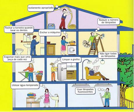 Poupar Energia em Casa Depois de leres estas páginas e de olhares para o mundo que te rodeia, certamente que te apercebeste que devemos poupar energia. Se observares com atenção a casa onde vives podes verificar quais as formas de energia que mais gastam em tua casa e em que medida as estamos a utilizar com inteligência. Aqui estão alguns conselhos para poupar energia em casa e ao mesmo tempo ter todo o conforto! . Para evitar grandes variações de temperatura, as paredes devem ter isolamento apropriado. . As janelas e as portas devem estar calafetadas. Os vidros devem ser duplos. Desta maneira podemos reduzir em 40% a dispersão do calor. . A temperatura no interior deve ser equilibrada de modo a não se exagerar na utilização de caloríficos no Inverno ou de refrigeradores no Verão. . A temperatura da água do banho também deve ser regulada. . A utilização frequente da panela de pressão poupa gás. . Abrir demasiadas vezes o frigorífico gasta mais energia, dado que a sua temperatura interior é em média 5ºC, enquanto no exterior é em média de 18ºC a 25ºC, e esta diferença provoca passagem de calor para o interior do frigorífico, que terá que trabalhar mais para recuperar o frio perdido. . Quando se utiliza a máquina de lavar deve encher-se a máquina e usar o programa correcto. . Na iluminação devem-se utilizar lâmpadas fluorescentes que, embora mais caras, são mais económicas no consumo do que as lâmpadas incandescentes. . O lixo pode ser aproveitado de novo. Contudo, a recolha selectiva do lixo exige a separação dos diferentes tipos de lixo a colocar nos ecopontos.