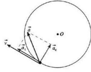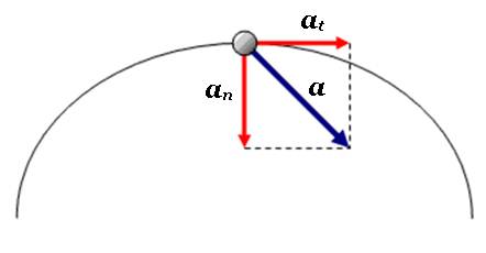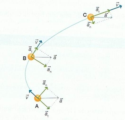 Fig.6 – Decomposição da aceleração na sua componente tangencial (at) e na sua componente normal ou centrípeta (an). Na figura 6, podemos ver que em cada ponto da trajectória, o vector aceleração, pode ser decomposto numa componente tangencial e numa componente normal (ou centrípeta) à trajectória.