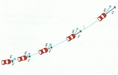Fig.4 – Visualização do vector velocidade tangente à trajectória. Aceleração A aceleração instantânea, a, ou simplesmente aceleração, é uma grandeza física que permite conhecer a variação da velocidade em cada instante. A aceleração instantânea, é igual ao limite para que tende a aceleração média, quando o intervalo de tempo, tende para zero. Portanto, é igual à taxa de variação temporal da velocidade, o que, matematicamente, corresponde à derivada do vector velocidade, em ordem ao tempo.