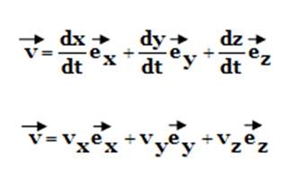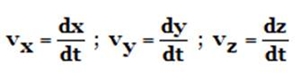 Onde vx, vy e vz são as componentes cartesianas do vector velocidade, que correspondem às derivadas em ordem ao tempo das coordenadas cartesianas, x, y e z, de posição.