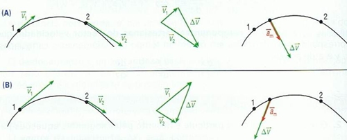 Fig.5 – Em (A) o movimento é acelerado e em (B) é retardado. Em qualquer um dos movimentos, am e Δv têm a mesma direcção e sentido e apontam para o interior da curva descrita pela partícula. Aceleração Centrípeta e Tangencial Sempre que um corpo se movimenta numa trajectória não rectilínea, age sobre ele uma força cujo efeito é alterar a sua direcção, para que o corpo em estudo possa percorrer a trajectória curvilínea. Essa força é chamada força centrípeta. De acordo com a segunda Lei de Newton (Fr = m x a), essa força é capaz de proporcionar no corpo uma aceleração, e esta é sempre perpendicular ao vector velocidade e orientada para o centro da trajectória. Essa aceleração é chamada aceleração centrípeta ou normal. É esta que provoca a variação da direcção do vector velocidade. O módulo da aceleração centrípeta é dado por: