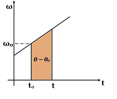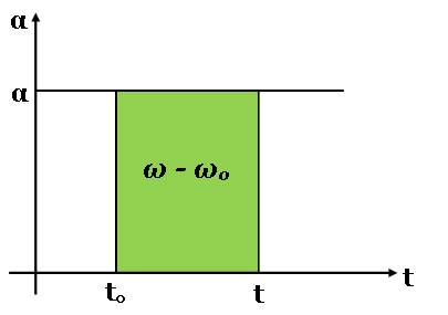 Gráfico 1 – aceleração angular Do gráfico tiramos a informação que a aceleração angular é constante e positiva, e nos movimentos circulares uniformes esta é sempre constante. A área verde abaixo da recta da aceleração α e o eixo do tempo, representa a variação da velocidade angular. Dada a aceleração angular podemos obter a variação de velocidade angular ω – ω0 entre os instantes t0 e t