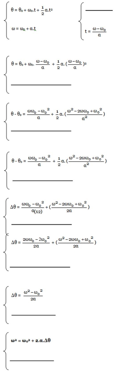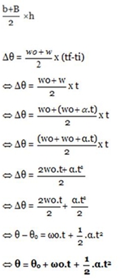 Tab.4 – Leis do movimento. O movimento é acelerado no sentido positivo quando, ω > 0 e α > 0, sendo acelerado no sentido negativo quando, ω <0 e α < 0. No entanto o movimento pode ser retardado também, sendo no sentido positivo quando, ω > 0 e α < 0 e retardado no sentido negativo quando, ω < 0 e α > 0. Através da área colorida (área de um trapézio), no gráfico 2 da página 12, conseguimos deduzir a seguinte fórmula: