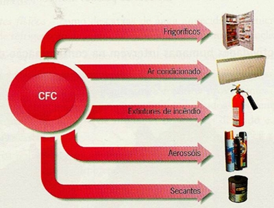 Fig.4 Exemplos de CFCs. O elevado desenvolvimento industrial e urbano leva a uma crescente de poluentes atmosféricos. Este efeito pode também acelerar-se por causas naturais. Assim, a erupção do vulcão Pinatubo, em 1991, libertou para a atmosfera mais de 20 milhões de toneladas de dióxido de enxofre, susceptíveis de se converterem em ácido sulfúrico. Este ácido favorece as reacções entre o cloro e o ozono e permite que se produzam com muito maior rapidez. Os países industrializados são os mais empenhados nas campanhas contra os CFC, mas são também os que colocam maior quantidade destes poluentes na atmosfera (EUA - 37.4%, União Europeia - 32.2% e Japão - 12.4%). Para recolher informações acerca do estado da camada do ozono, os cientistas utilizam aviões e satélites. Alguns aerossóis trazem nas suas embalagens símbolos indicando que não prejudicam o meio ambiente. Sabias que…