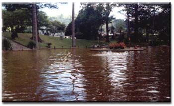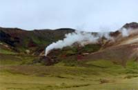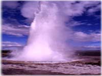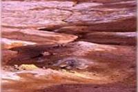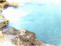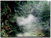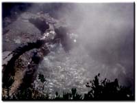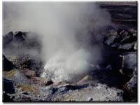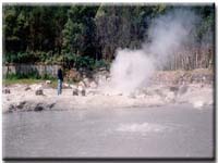 Fig.9 – “Piscina” de água quente e ferruginosa no Parque das Furnas. Existem ainda outras manifestações de vulcanismo, verdadeiras fontes quentes e intermitentes de água - géiseres. A água subterrânea que se encontra nas fissuras e cavidades, em contacto com a elevada temperatura das rochas vai aquecendo gradualmente. A elevada pressão a que a água se encontra (provocada pelo seu peso) faz aumentar o ponto de ebulição da água e, quando a temperatura da água atinge um ponto crítico, entra rapidamente em ebulição. O vapor de água obriga então a água a subir de forma violenta, em forma de jacto, dando origem a outra manifestação de vulcanismo, mais espectacular, mas também mais rara. Este fenómeno pode observar-se nos Estados Unidos e na Islândia.