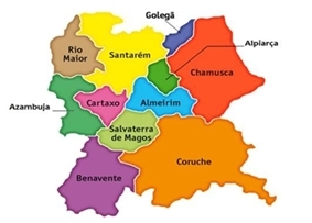 . Alpiarça; . Azambuja; . Benavente; . Cartaxo; . Chamusca; . Coruche; . Golegã; . Rio Maior; . Salvaterra de Magos; Fig.1 - Lezíria do Tejo . Santarém. Os principais concelhos são os concelhos de Almeirim, Cartaxo, Rio Maior e Santarém. Todos estes municípios dividem-se num total de 91 freguesias, o que dá uma média de cerca de oito freguesias por concelhos. A proximidade da Lezíria do Tejo à capital do país associada às novas condições de acessibilidade e de transporte da sub-região, têm sido fulcrais na dinâmica territorial da Lezíria do Tejo. A economia municipal desta assenta na agro-pecuária, silvicultura, indústria alimentar, comércio retalhista, reparação automóvel e de maquinaria agrícola, metalomecânica, construção civil e turismo (restauração e hotelaria). Foi em Santarém, muito antes de Lisboa, que D. Afonso Henriques conquistou território aos mouros, mas a cultura árabe deixou vestígios no trabalho agrícola. Da época medieval ficaram vestígios como o castelo de Alcanede, mas é depois com o gótico, o renascimento e o barroco que mais se edificará o Ribatejo.