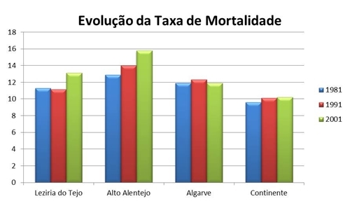 Como se verifica no gráfico acima apresentado, as três sub-regiões escolhidas apresentam valores bastante diferentes, no qual quase sempre houve uma subida constante de 1981 a 2001. Estes valores verificam-se, na Lezíria do Tejo, e no Alto Alentejo, pois sendo regiões do interior, a população é mais envelhecida e acaba por morrer em maior número. Os idosos acabam por falecer mais tarde e em maior número, pois são regiões pobres e pouco industrializadas, sendo assim têm uma menor assistência médica, e grande parte deles têm uma reforma miserável que não dá para pagar medicamentos nem outras operações necessárias. Mas o mesmo não acontece no Algarve, pois sendo uma região do litoral, e principalmente com uma grande e rica economia com já foi referido noutros pontos, a população é mais jovem, e há menos idosos, o que torna a probabilidade de falecer muito menor. E ainda porque sendo uma região do litoral, é bastante desenvolvida, havendo assim melhores cuidados médicos e maior possibilidade de ter uma vida mais saudável. No continente regista-se uma ligeira subida, pois a população é na sua maioria idosa. 4-ESTRUTURAS ETÁRIAS Evolução dos grandes grupos etários nas 3 sub-regiões