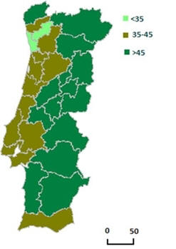 Como se observa no mapa anterior, os maiores valores de I.D.T observam-se nas zonas do interior. Assim, sempre que o seu valor é elevado, significa a existência de uma grande dependência (jovens / idosos), relativamente á população em idade activa. As razões que levam ao elevado índice de dependência total são o baixo nível de desenvolvimento económico, o elevado êxodo rural, população predominantemente idosa, ao ser idosa normalmente é não activa e há um elevado abandono dos familiares idosos por parte dos mais jovens. 5–Recursos Humanos.