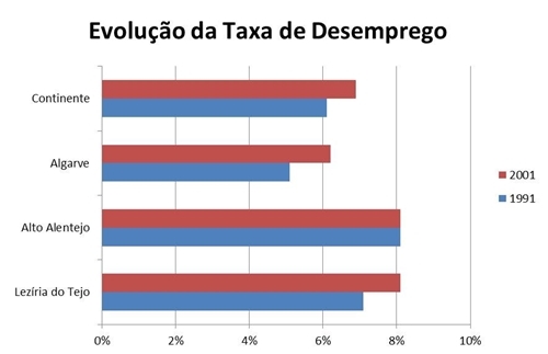 De uma maneira geral, Portugal apresenta uma elevada taxa desemprego sendo menor no período de 1991 e maior no período de 2001. A taxa de desemprego em Portugal tem vindo a aumentar progressivamente desde, sobretudo nas sub-regiões da Lezíria do Tejo e Algarve, mantendo-se igual na sub-região do Alto Alentejo. Este acontecimento deve-se, principalmente, aos baixos salários da população portuguesa, principalmente na sub-região do Alto Alentejo, pois é uma sub-região localizada no Interior, menos desenvolvida e com poucos serviços. Relativamente às sub-regiões do Algarve e Lezíria do Tejo, também apresentam uma elevada taxa de desemprego, devido, sobretudo, à desigualdade entre homens e mulheres e à proliferação dos contratos a curto prazo. Assim, a taxa de desemprego tem aumentado ao longo destes anos, levando á insegurança e instabilidade da população, bem como a precariedade do emprego, e os baixos salários da população, levando á pobreza do país.