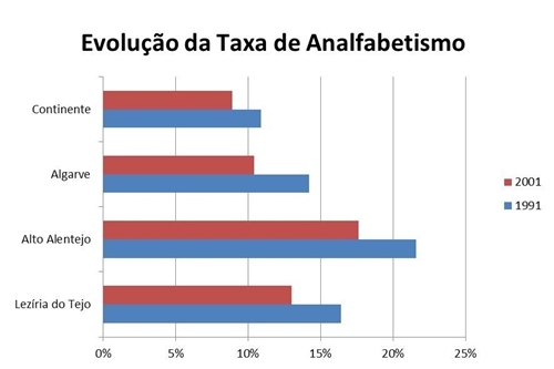 Do ano de 1991 para o ano de 2001, houve uma redução bastante significativa da Taxa de analfabetismo em Portugal. A sub-região do Algarve, é uma sub-região que apresenta a Taxa de analfabetismo mais baixa, juntamente com a Lezíria do Tejo, pois estes têm-se desenvolvido socioeconomicamente, investindo na construção de escolas e outros estabelecimentos de ensino, aumentando assim o grau de instrução da sua população; enquanto que a sub-região do Alto-Alentejo apresenta um menor desenvolvimento, pois a sua população é predominantemente idosa, com um baixo nível de instrução, onde a escola é pouco valorizada, levando ao abandono precoce da escola, e assim a uma elevada taxa de analfabetismo. Diagramas triangulares Lezíria do Tejo O diagrama acima exposto, representa a evolução dos sectores de actividade da sub-região da Lezíria do Tejo. O sector primário – ligado à agropecuária e ao extrativismo. O sector secundário – ligado à manufactura, produção de bens de consumo e máquinas industriais. O sector terciário – ligado aos serviços e comércio. Tal como na sub-região do Algarve os valores do sector primário diminuíram na sub-região da Lezíria do Tejo no período compreendido entre 1991 e 2001, devido à crescente utilização de máquinas nos trabalhos que substituem o homem. Os valores do sector secundário mantiveram-se regulares neste período. No sector terciário verificou-se também um aumento, devido ao desenvolvimento da região com o melhoramento do ensino e maior número de pessoas com formação profissional. Alto Alentejo O diagrama acima exposto, representa a evolução dos sectores de actividade da sub-região do Alto Alentejo. O sector primário – ligado à agropecuária e ao extrativismo. O sector secundário – ligado à manufactura, produção de bens de consumo e máquinas industriais. O sector terciário – ligado aos serviços e comércio. Observando o diagrama correspondente pode verificar-se que os valores do sector primário também diminuíram entre 1991 e 2001, mas não com tanta evidência como nas outras duas sub-regiões em estudo. Tal como nas outras duas sub-regiões os valores do sector secundário mantiveram-se regulares neste período, e no sector terciário verificou-se também um aumento, devido ao desenvolvimento da região com o melhoramento do ensino e maior número de pessoas com formação profissional. Algarve O diagrama triangular acima exposto, representa a evolução dos sectores de actividade da sub-região do Algarve. O sector primário – ligado à agropecuária e ao extrativismo. O sector secundário – ligado à manufactura, produção de bens de consumo e máquinas industriais. O sector terciário – ligado aos serviços e comércio. Observando o diagrama verifica-se que os valores do sector primário diminuíram durante o período de tempo entre 1991 e 2001, o que pode ter explicação na crescente utilização de máquinas nos trabalhos do campo e agropecuária, em substituição do homem. Os valores do sector secundário mantiveram-se regulares neste mesmo período. O sector terciário registou um aumentou, explicado devido ao desenvolvimento da região do Algarve como região turística, nomeadamente o melhoramento do ensino e o aumento do número de pessoas com formação profissional, bem como a chegada de pessoas com formação profissional provenientes de outras zonas do país à procura de novas oportunidades. 6-PONTOS FRACOS E FORTES DAS TRÊS SUB-REGIÕES Síntese dos principais pontos fortes e fracos das três sub-regiões As três sub-regiões em estudo, têm grandes diversidades, devido a vários factores anteriormente referidos. Cada uma das sub-regiões em estudo apresenta pontos fortes e fracos que divergem entre si. É o caso da economia, em que o Alto Alentejo e a Lezíria do Tejo, apresentam elevados valores no sector primário e secundário. Já no Algarve registam-se valores mais elevados no sector terciário. Os elevados valores no sector primário e secundário, no Alto Alentejo e Lezíria do Tejo, traduzem o que é na realidade o ponto forte destas sub-regiões, a agricultura. Esta, com estas características, é devida aos excelentes solos que as estas sub-regiões apresentam. Nestas sub-regiões, há também fortes sinais de uma industrialização fraca, que é nestas sub-regiões um dos seus pontos fracos. Os elevados valores do sector terciário, no Algarve, traduzem, novamente, o seu ponto forte, o turismo. Este, que é muito forte nesta sub-região, necessita de bens e serviços capazes de satisfazer as necessidades da população local, na altura, e estes constituem então o sector terciário. Outro ponto forte do Algarve é a população. A população na região referida é na sua maioria uma população jovem, o que trás muitas vantagens, como a maior actividade e produção de riqueza para o país. A população é jovem, porque a T.N e o I.S.F são elevados. Mas o mesmo não acontece na Lezíria do Tejo e o Alto Alentejo, em que a população passa a ser um ponto fraco das sub-regiões. É um ponto fraco pois população nessas sub-regiões é na sua maioria idosa, que tem como consequências a menor actividade da população o que diminui a produção de riqueza do país, há um grande gasto com as reformas e cuidados por parte da segurança social. Principais problemas sócio-demográficos das três sub-regiões. Desde o início do século XX que Portugal se debate com diversos problemas sócio-demográficos, que afectam as pessoas e a sociedade em geral de forma muito diversa e em variados níveis. Os problemas fundamentais são: . O declínio da fecundidade. . O envelhecimento da população. . A situação perante o emprego / desemprego. . O baixo nível educacional. Os níveis e valores de cada um dos problemas divergem, naturalmente, nas três diferentes sub-regiões em estudo. O declínio da fecundidade O declínio da fecundidade tem sido uma 