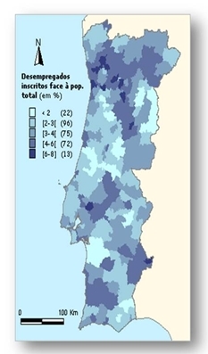 indústria que substituem o homem. Consequências: O aumento do desemprego significa perda de riqueza para o país, pois não aproveita os recursos humanos disponíveis para outras actividades, há a perda de receitas públicas para a segurança social e ainda há aumento dos encargos com o pagamento dos subsídios de desemprego. O desemprego distribui-se de forma diferente por todo o país. Através do mapa podemos identificar os diferentes valores de taxa de desemprego das três sub-regiões em estudo: