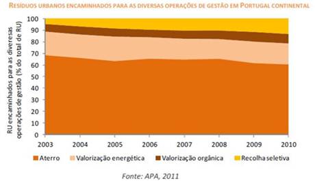 Esquema 3 – Destinos dos resíduos Em 2010 o principal destino dos cerca de 5 184 milhões de toneladas de resíduos urbanos produzidos no Continente foi a deposição em aterro (61%), seguindo-se a incineração com recuperação de energia (18%), a recolha seletiva com vista a reciclagem (13%) e a valorização orgânica - compostagem (8%). Em comparação com 2008 verifica-se uma diminuição ligeira na quantidade de resíduos depositados em aterro (- 7%).
