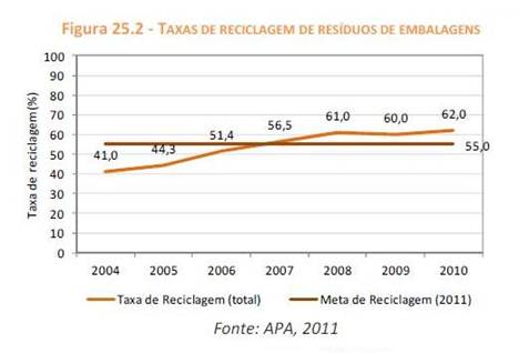 Figura 8 – Fardos para reciclagem Foram estabelecidas a nível europeu metas a alcançar pelos Estados membros de maneira a aumentar a percentagem de resíduos de embalagens reciclados. Pelo que desde meados de 2006 que a taxa de reciclagem de resíduos de embalagens é superior à meta estabelecida pela União Europeia (mínimo de 55%).