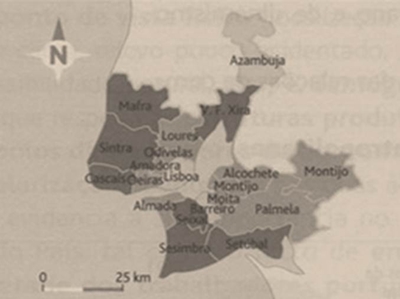 Área Metropolitana de Lisboa A Área Metropolitana de Lisboa é uma região que engloba 18 municípios da Grande Lisboa e da Península de Setúbal. É o maior centro populacional do país, com 2 819 433 habitantes (2008), cerca de 25% da população portuguesa, 3.3% do território nacional, 30% das empresas nacionais, 33% do emprego e contribui com mais de 36% do PIB nacional. Constitui uma entidade de nível intermédio da Administração Pública Local, de natureza associativa. Tem natureza associativa e visa a prossecução de interesses comuns dos municípios que a integram. Os municípios que compõem a Área Metropolitana de Lisboa são 18: . Alcochete . Almada