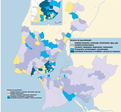 Estas especializações económicas de cada freguesia revelam um mosaico complexo, marcado pelos seguintes traços gerais: . As freguesias com especialização em actividades financeiras, operações sobre imóveis e serviços às empresas têm uma evidente centralidade geográfica . A indústria transformadora é bastante importante na maioria da margem Norte, no arco ribeirinho a Sul do Tejo e ainda no núcleo Palmela/Setúbal; . Importância do conjunto de actividades “indústrias extractivas, construção civil, electricidade, água e gás” nas freguesias mais rurais da península de Setúbal e ainda em alguns espaços a Oeste da cidade de Lisboa, caracterizados por intensos processos de suburbanização; . Padrão geográfico fragmentado das freguesias especializadas em: comércio, reparação, alojamento e restauração. Existem, no entanto, alguns casos junto ao litoral que correspondem a importantes estâncias balneares e de lazer: Ericeira, Praia das Maçãs/Praia Grande, Guincho/Cascais/Estoril/Parede, Costa da Caparica, Sesimbra; . Localização predominantemente periférica das freguesias com especializadas no sector de transporte, armazenagem e comunicação, o que reflecte o facto de estas serem actividades fortemente consumidoras de espaço. AMP Na Área Metropolitana do Porto, existem empresas com um nível organizativo e um nível de competitividade de médias empresas europeias. Algumas destas dispõem até, actualmente, de estruturas próprias de I&D. A AMP conta ainda com algumas estruturas universitárias de prestígio internacional na área da Investigação, como por exemplo o IBMC e o IPATIMUP. Existem também empresas fortemente investidoras em I&D, como: . Bial (no sector Alimentar), com o empenho da Escola Superior de Biotecnologia . Unicer, . RAR . Lactogal . INEGI . INESC As empresas mais em voga ao nível de valorização e de importância internacional são: . EFACEC . Salvador Caetano . Siemens Outras áreas que são também exemplos de importantes “clusters” e excelentes no que toca à valorização internacional são as ciências e a economia marítima (através do laboratório CIMAR e da indústria náutica). No que toca às Universidades, como a do Minho e a de Aveiro, podem encontrar-se talentosos grupos de investigadores, constituindo suportes importantes na AMP. Até mesmo nas áreas industriais mais tradicionais, como o Calçado, os Têxteis/Vestuário e o Mobiliário, também se encontram empresas com considerável dimensão e, principalmente, capacidade inovadora. Ainda nestas áreas se podem constituir importantes "clusters" intensivos em tecnologia e mesmo inovadores.