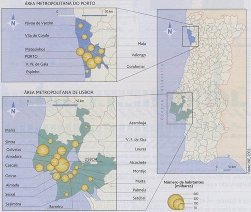 A formação das áreas metropolitanas de Lisboa e do Porto O crescimento demográfico e funcional provocou o consequente crescimento das cidades, em geral, e de Lisboa e do Porto, em particular. Devido à elevada pressão demográfica e funcional existente no interior da cidade surgiu um movimento divergente. Neste movimento é característico que as periferias sejam alvo de uma crescente procura, tanto para construção de habitações como para a implantação de indústrias e serviços. Deste modo, vão surgindo áreas que constituem importantes bacias de emprego e outras áreas onde, pelo contrário, a função residencial é predominante. Muitas aldeias e vilas vão, devido a esta crescente procura por parte da população e dos sectores de actividade tradicionalmente urbanos, sofrendo uma expansão. As consequências dessa expansão são as elevações a cidade. Isto aconteceu com a Amadora, Almada, Montijo e Odivelas (periferia de Lisboa). Já no âmbito da periferia da cidade do Porto, aconteceram situações iguais com Vila Nova de Gaia, Maia, Matosinhos e Ermesinde. Assim foram formadas as áreas metropolitanas de Lisboa e do Porto, de modo a reconhecer e a promover ainda mais a existência de uma relação de interdependência e interacção entre as várias cidades de cada área.