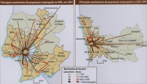 Lisboa e Porto têm vindo a sofrer um decréscimo demográfico. Esta situação é testemunhada pela variação negativa destes dois concelhos, a que se junta: . no caso da AML: Barreiro, Amadora; . no caso da AMP: Espinho. Contrariamente, como pólos de maior tracção populacional, temos: . Sintra, Sesimbra, Seixal, Alcochete, Mafra e Palmela, na AML; . Maia, na AMP. Estas alterações permitem antever a importância e a alteração na mobilidade da população, assistindo-se à perda da função residencial em consequência da sua crescente terciarização, aliada à má qualidade ambiental nos concelhos com uma variação negativa. Os concelhos periféricos são os que registam taxas de crescimento populacional mais elevadas, uma vez que beneficiarem de todos os factores já mencionados anteriormente, de que se destaca a maior acessibilidade, por exemplo, na AML, a Lisboa, resultante do alargamento do tabuleiro da Ponte 25 de Abril à travessia ferroviária, da construção da Ponte Vasco da Gama ou de novos interfaces de transportes como a Gare do Oriente. Se quisermos comparar as duas áreas metropolitanas, facilmente concluímos que: . as densidades populacionais são mais elevadas na área metropolitana do Porto;