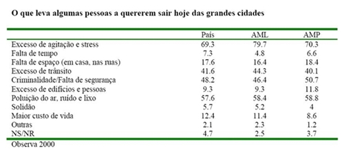 Estas podem ser algumas das razões que as levam a abandonar os grandes centros urbanos para passar a morar nas áreas periféricas das cidades. Através da análise desta tabela podemos concluir que: . na AML e na AMP e no resto do país as principais razões de queixa que os habitantes das grandes cidades têm são o “excesso de agitação e de stress”, seguido de “poluição do ar, ruído e lixo” e de “criminalidade/ falta de segurança” . outro grande problema, para toda a população portuguesa, é o excesso de trânsito . no resto do país e na AMP as pessoas também se preocupam com a falta de tempo, um pouco mais do que na AML . na AMP a população preocupa-se mais com o excesso de edifícios e de pessoas do que na AML . a solidão afecta mais pessoas na AML do que na AMP . quem se preocupa mais com o custo de vida é a população residente no restante território do nosso país, e isso tem mais importância para os residentes da AML que para os da AMP . tanto no país como na AML e na AMP existem ainda outras razões de queixa que não são referidas especificamente na tabela . depois de todos estes factores, é normal que abandonar as grandes cidades seja considerada uma ideia bastante plausível para muitos portugueses