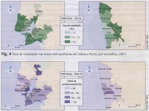 Seguidamente ao que foi referido, faz sentido concluir que, como podemos observar nos seguintes mapas, as zonas periféricas das área metropolitanas (ou seja, aquelas cidades que não são as sedes) ganham terreno em relação a Lisboa/ Porto, uma vez que: . possuem maior taxa de natalidade . possuem menor taxa de envelhecimento