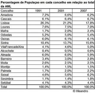 Análise da variação populacional da AML: Concelhos cuja população aumentou: Cascais, Mafra, Odivelas, Oeiras, Sintra, Vila Franca de Xira, Alcochete, Montijo, Palmela, Seixal, Sesimbra, Setúbal Concelhos cuja população diminuiu: Amadora, Lisboa, Loures, Almada, Barreiro, Moita Note-se que um dos concelhos cuja população diminuiu foi o de Lisboa, o que mostra a deslocação da população para as áreas periféricas, como foi referido anteriormente neste trabalho. Numa análise geral destes dados podemos concluir que na maior parte dos concelhos da AML a população diminuiu. AMP: