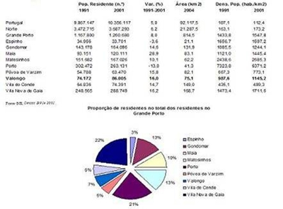 Nesta imagem podemos observar, entre outras coisas, que a variação da população foi negada em Espinho e no Porto. A situação é semelhante à da área metropolitana de Lisboa: foram mais os concelhos que aumentaram a sua população do que aqueles que a viram diminuir. E nos casos em que diminuiu, mais uma vez a cidade-mãe foi uma das afectadas, tal como na AML. Podemos também observar a distribuição da população na área metropolitana do Porto, nos seus diferentes concelhos integrantes. Este facto realça mais uma vez o movimento de deslocação da população para áreas suburbanas.