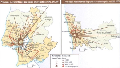 Comparando as duas áreas metropolitanas, podemos concluir que as migrações pendulares são mais intensas na Área Metropolitana de Lisboa, verificando-se que em alguns concelhos mais de 50% da sua população residente exerce a sua actividade noutro concelho. Na área metropolitana do Porto os movimentos pendulares são menos evidentes do que na área metropolitana de Lisboa, mas ainda assim eles existem e são consideráveis. As deslocações pendulares entre outros concelhos, sem a envolvência das cidades principais, existem nas duas áreas metropolitanas. Há também pessoas que se deslocam de concelhos exteriores às áreas metropolitanas, para lá trabalhar, tanto nas cidades principais como nas outras cidades pertencentes a elas. Estes movimentos pendulares tão vincados demonstram: . a importância económica das áreas metropolitanas e as oportunidades que elas oferecem à população; . a falta de oportunidades oferecidas pelas áreas periféricas, apesar de estarem a desenvolver-se e a tornar-se cada vez mais dinâmicas e empreendedoras