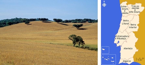 Alentejo RELEVO - na região agrária do Ajentejo, o relevo é predominantemente aplanado. Denomina-se por peneplanície a extensa planície alentejana. CLIMA - o clima é mediterrânico quente e seco e pode ser caracterizado pelos seguintes factores: temperaturas médias suaves no Inverno e elevadas no Verão, amplitude de variação térmica anual moderada e precipitação fraca, registando-se quatro a seis meses secos. Mais especificamente, o interior alentejano, com maior amplitude de variação térmica anual e menor precipitação, o que torna esta região particularmente vulnerável à ocorrência de secas; o litoral ocidental, onde a influência é maior e, por isso, as temperaturas médias são mais amenas e existe maior humidade. DENSIDADE POPULACIONAL - o Alentejo é caracterizado por uma fraca densidade populacional que se deve, essencialmente, às condições naturais de clima, relevo e solos pouco favoráveis, ao fraco dinamismo económico e social e às poucas oportunidades de emprego, levando a uma desertificação do Alentejo. Estes factores têm como consequência o êxodo rural. O alentejo é a região agrária com maior índice de envelhecimento. ESTRUTURA ETÁRIA DA POPULAÇÃO - de acordo com a estrutura etária, a população desta região agrária é caracterizada pelos seguintes factores: redução da população de jovens e aumento da de idosos, o que leva a um duplo envelhecimento da estrutura etária da população (inverção da pirâmide etária). A redução da proporção de jovens deve-se à diminuição do índice sintético de fecundidade (número médio de filhos por cada mulher em idade fértil – dos 15 aos 49), que já é inferior ao índice de renovações de gerações (número mínimo de filhos que, em média, cada mulher deveria ter, durante a sua vida fecunda, para assegurar a substituição de gerações) e o aumento da proporção de idosos deve-se ao prolongamento da esperança média de vida.