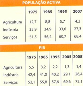 Evolução da estrutura da população activa e do PIB, em %