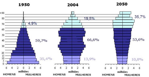 Figura 8 - Evolução da estrutura da população activa e do PIB, em % A necessidade de controlar a natalidade no período de recuperação económica A política antinatalista imposta no Japão foi inspirada pelo fim da guerra, pela escassez de recursos e pelo cenário de um Japão superpovoado. Com o intuito de proceder ao controlo da natalidade, foi legalizada a interrupção voluntária da gravidez, em 1948; foi autorizada a venda de contraceptivos, em 1949; regulamentou-se a distribuição gratuita de anticoncepcionais, em 1954, além de existir uma intensa propaganda a favor do planeamento familiar. Através da implementação destas medidas, o “baby-boom” foi controlado e ocorreu a desaceleração do crescimento demográfico. No entanto, a diminuição da natalidade e o aumento da esperança média de vida explicam o rápido envelhecimento da população, o que poderá causar problemas ao desenvolvimento do país no futuro. Como podemos verificar na figura 2, no ano de 2004, a pirâmide etária regista uma maior percentagem de população idosa que população jovem, ou seja, a população japonesa está envelhecida. O mesmo acontece com a previsão para 2050, mas ainda com maior discrepância entre os valores.