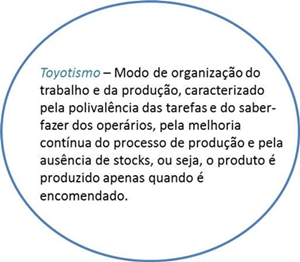 Figura 13 - Iene, notas e moedas utilizadas no Japão O processo de industrialização japonês O Japão que conhecemos hoje, associado às indústrias de alta tecnologia, é resultado de um processo de industrialização, que foi despoletado em 1950 e continua até aos dias de hoje. Este processo de industrialização foi faseado em 4 fases: 1. A primeira fase consistiu numa política mais dirigida à importação, devido à actividade industrial estar concentrada na indústria do algodão; 2. Nesta segunda fase, a indústria do algodão foi ultrapassada pelas indústrias pesadas, orientadas para a utilização pacífica do aço. É também caracterizada pelas medidas de protecção à produção e ao mercado interno. Apostou-se, então, na exportação de aço, navios e máquinas, em vez dos tecidos de algodão e outros bens de qualidade inferior. O objectivo era aumentar as exportações para pagar as crescentes importações de bens energéticos, de produtos alimentares e matérias-primas; 3. Na terceira fase, o processo de industrialização foi diversificado, apostando-se na indústria mecânica e electrónica. Foi uma fase dominada pelas políticas económicas orientadas para a exportação. 4. Na 4ª e última fase, que está presente nos dias que correm, caracteriza-se pelas indústrias de alta tecnologia e pela estratégia de deslocalização industrial para os países vizinhos. Tendo conhecimento das suas limitações geográficas e económicas, os japoneses sentiram a necessidade de criar um modelo de produção adequado às suas características e necessidades – o toyotismo.