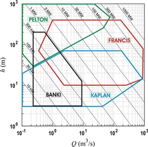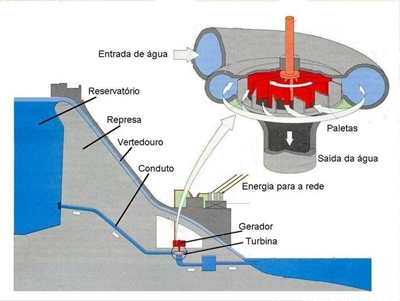 Introdução Este trabalho foi realizado no âmbito da disciplina de Geografia A e tem como tema principal a energia Hidroeléctrica. Ao longo deste trabalho iremos falar sobre o que é a energia Hidroeléctrica, de onde surgiu e quem foi que a descobriu, iremos apresentar também as principais centrais em Portugal e mais importante de todas e explicaremos no que consiste e nos impactos que poderá vir a ter no ambiente. O que é a Energia Hidroeléctrica A energia hidroeléctrica é a obtenção de energia eléctrica através do aproveitamento do potencial hidráulico de um rio. Para que esse processo seja realizado é necessária a construção de centrais em rios que possuam elevado volume de água e que apresentem desníveis em seu curso. A força da água em movimento é conhecida como energia potencial, essa água passa por tubulações da central com muita força e velocidade, realizando a movimentação das turbinas. Nesse processo, ocorre a transformação de energia potencial (energia da água) em energia mecânica (movimento das turbinas). As turbinas em movimento estão conectadas a um gerador, que é responsável pela transformação da energia mecânica em energia eléctrica.  Fig. 1 – Esquema de funcionamento de uma hidroeléctrica Normalmente as centrais hidroeléctricas são construídas em locais distantes dos centros consumidores, esse fato eleva os valores do transporte de energia, que é transmitida por fios até as cidades. A eficiência energética das hidroeléctricas é muito eficaz, em torno de 95%. O investimento inicial e os custos de manutenção são elevados, porém, o custo do combustível (água) é nulo. A origem e a descoberta da Energia Hidroeléctrica A energia hídrica tem sido utilizada pelo Homem desde há bastantes séculos, inicialmente apenas na produção de energia mecânica para, por exemplo, a moagem de cereais e para bombear água. A produção de energia hidroeléctrica surgiu durante o final do século XIX e o início do século XX, após a invenção do gerador eléctrico e do desenvolvimento de turbinas mais eficientes. Estes sistemas permitiram a produção de energia eléctrica em Centrais de pequena e média dimensão que alimentavam redes eléctricas locais e regionais. Ao longo da primeira metade do século XX assistiu-se a outra mudança, aquando da expansão da rede eléctrica e da construção de redes de alta tensão para o transporte de energia a maiores distâncias. Surgiram então as Centrais hidroeléctricas de grande dimensão, com várias centenas de MW de potência instalada, construídas em cursos de água com elevado potencial hídrico.  Fig. 2 – Itaipu, a maior hidroelétrica do mundo Actualmente, as centrais hidroeléctricas são responsáveis por aproximadamente 18% da produção de energia eléctrica no mundo. Esses dados só não são maiores pelo fato de poucos países apresentarem as condições naturais para a instalação de centrais hidroeléctricas. As nações que possuem grande potencial hidráulico são os Estados Unidos, Canadá, Brasil, Rússia e China. No Brasil, mais de 95% da energia eléctrica produzida é proveniente de centrais hidroeléctricas. Como funcionam as centrais Hidroeléctricas? O ciclo da água está na origem da energia hídrica, uma vez que a precipitação que ocorre sob a forma de chuva ou neve nas zonas mais elevadas (montanhas) dá origem a escoamentos subterrâneos e de superfície que alimentam os cursos de água. Os rios apresentam desta forma um potencial de energia hídrica resultante do seu caudal e da variação de altitude (queda) ao longo do seu curso para o mar ou para lagos. A potência que é aproveitada numa Central hidroeléctrica é determinada através de P = r gQhn em que r é a massa volúmica da água [1000 kg/m3], g é a aceleração da gravidade [g = 9.8 m/s2], Q é o caudal de água [m3/s], h é a diferença de cotas [m] corrigida devido às perdas de carga nas tubagens e n é o rendimento da central ( 80 a 90%). A potência é maior quanto maior for o caudal e/ou a diferença de cotas. Por outro lado, o caudal de um rio não é constante ao longo do ano e varia de ano para ano, em função da quantidade de precipitação na bacia hidrográfica, pelo que se torna necessário conhecer o caudal médio diário ao longo do ano. Na Figura 3 está representado um exemplo da chamada curva de duração de caudal, que representa o número de dias que um determinado valor de caudal médio diário é ultrapassado. A energia disponível está relacionada com a área abaixo da curva, sendo a área de exploração determinada em função da turbina utilizada.  Fig. 3 – Curva de duração do caudal Turbina hidráulica A escolha da turbina depende da queda útil (h), do caudal (Q) e da potência pretendida, como se mostra na Figura 4.  Fig. 4 – Ábaco para a escolha de turbinas Existem duas categorias principais de turbinas: i) turbinas de ação ou impulso, utilizadas para caudais baixos e quedas úteis elevadas; e ii) turbinas de reação, utilizadas em quedas pequenas ou médias e caudais elevados. No primeiro caso a turbina é actuada pela água à pressão atmosférica, enquanto no segundo caso as pás da turbina são actuadas por água sob pressão que vai variando ao longo de uma conduta (voluta e difusor). Dentro da categoria de turbinas de acção estão mais vulgarizadas as turbinas de Pelton e de Banki (para mini-hídricas), e na categoria de turbinas de reacção encontram-se as turbinas de Kaplan e de Francis.  Fig. 5 – Turbinas de Pelton  Fig. 6 – Turbinas de Francis  Fig. 7 – Turbinas de Kaplan Pelton Nas turbinas Pelton não há palhetas estáticas e sim um conjunto de bocais ou injectores, cada qual com uma agulha móvel (semelhante a uma válvula) para controlar a vazão. Nessas turbinas, a pressão da água é primeiro transformada em energia cinética pelo bocal, que acelera a água até uma alta velocidade. O jacto de água é dirigido par