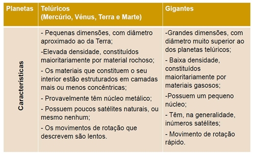 Planetas Principais De acordo com as características físicas e químicas, os planetas principais são divididos em: . Planetas telúricos . Planetas gigantes ou gasosos Planetas Telúricos