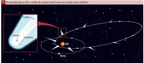 Um cometa é formado por uma parte sólida, o núcleo que é constituído por partículas de silicatos e por uma mistura de gases congelados. Quando o núcleo se aproxima do Sol, a radiação solar faz sublimar o gelo da superfície do núcleo e libertam-se gases que formam uma aura, a cabeleira à volta do núcleo. Forma-se ainda a cauda, que se dirige em sentido contrário à posição do Sol e que é constituída pelos gases e pelas poeiras libertadas do núcleo.