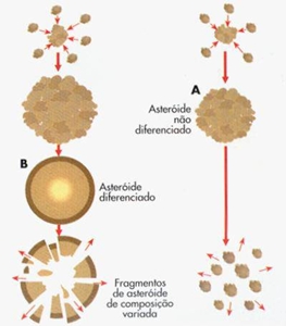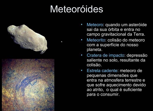 Os cometas quando aquecem e dilatam podem fragmentar-se em partículas maiores ou menores, que podem intersectar a órbita da Terra e originar as chamadas chuvas de estrelas. Meteoróides . Partículas rochosas de variadas dimensões que resultam da colisão entre asteróides ou da desagregação de cometas; . Alguns meterróidessão atraídos pelo campo gravitacionalterrestre e penetram na nossa atmosfera. Durante a entrada na atmosfera terrestre, o meteoróidesofre aquecimentodevido ao atrito, torna-se incandescentee deixa um rasto luminoso chamado meteoro ou estrela cadente.