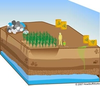 Figura 2 – Contaminação de Solos O que muitas vezes confunde as pessoas, é como é que os adubos químicos, que são desenhados para fazer crescer vida, podem afectar negativamente o ambiente. Um dos motivos pelos quais os adubos químicos podem poluir o Meio Ambiente, é que alguns deles dissolvem-se na água, facto que acarreta duas consequências: 1.Uma parte é rapidamente absorvida pelas raízes das plantas o que as danifica tornando-as mais susceptíveis a pragas e doenças, além de menos saborosas e com o seu teor nutritivo empobrecido. 2.Outra parte (muitas vezes a maior parte) é levada pelas águas das chuvas e regas, indo poluir rios e lagos, causando juntamente com os despejos de esgotos, a morte de um rio ou lago por “asfixia”, pois os excessivos nutrientes estimulam um crescimento excessivo das algas que retiram o oxigénio da água. Como contrariar o impacto humano na Geosfera Apesar da grave situação ambiental que se vive no nosso Planeta, existem soluções. Por exemplo, no caso da contaminação dos solos e das águas através dos adubos químicos, referido no tópico anterior, existe uma forma que além de evitar os danos causados pelos químicos tóxicos, é ainda mais económica. Trata-se da compostagem, processo através do qual se produz fertilizante a partir de lixo orgânico, como restos alimentares. Outro aspecto positivo da compostagem é que permite a reutilização do lodo dos esgotos, que de outra maneira seria despejado inutilmente em algum curso de água, que traria ainda mais danos ambientais.