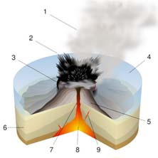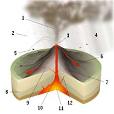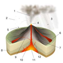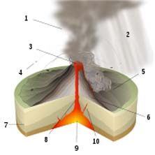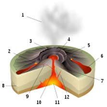 Introdução Neste trabalho de pesquisa, eu irei abordar o tema, tipos de erupções vulcânicas e material expelido durante as mesmas. Irei nomear e caracterizar os principais tipos de erupções vulcânicas. A erupção vulcânica é um fenómeno da natureza, geralmente associado à expulsão do magma de regiões profundas da Terra na superfície do planeta. As camadas de rochas formadas por erupções magmáticas são chamadas de "derrames", pois a rocha espalha-se e solidifica-se na superfície do globo. A lava arrefecida gera normalmente um solo fértil para a prática da agricultura. Existem diferentes tipos de erupções vulcânicas, diferindo na proporção e tipo de material expelido e na violência dessa expulsão. Tipos de Erupções Vulcânicas A proporção de rochas, gases e lava que um vulcão emite determina o tipo de erupção. Os tipos de erupção recebem normalmente nomes relacionados com vulcões famosos onde se observou um comportamento vulcânico característico. Alguns vulcões exibem somente um tipo de erupção durante um intervalo de actividade, enquanto que outros podem mostrar uma sequência de diferentes tipos. As erupções vulcânicas podem ser divididas quanto à sua violência em explosivas e efusivas. As erupções explosivas são causadas pela acumulação de vapor e gases sob elevadas pressões, que são libertados de forma violenta. A interacção de águas subterrâneas e magma leva à produção de vapor, que retido debaixo de camadas de rocha se acumula até atingir uma pressão suficientemente elevada para a destruir e libertar-se para a atmosfera. Gases que eventualmente estejam dissolvidos no magma em ascensão no vulcão, por acção da elevada pressão no seu interior, podem também expandir rapidamente após a explosão inicial de vapor, formando uma explosão secundária que é por vezes mais intensa que a primária e que pode formar um fluxo piroclástico. Em contraste, nas erupções efusivas existe uma libertação lenta de lava de baixa viscosidade e com reduzido conteúdo volátil, não existindo fenómenos explosivos associados a este tipo de erupção. Os vulcanólogos classificam as erupções da seguinte forma: