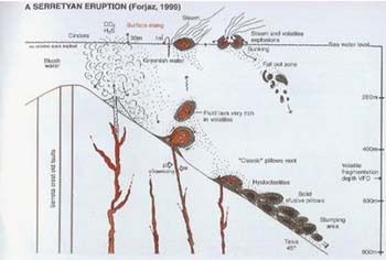 O vulcão da Serreta tinha o topo da sua chaminé a uma profundidade entre 400 e os 600 m abaixo do nível do mar, deste modo a pressão da coluna de água (o peso da própria água) impedia o desenvolvimento de vários fenómenos eruptivos típicos das erupções submarinas pouco profundas, como os jactos de piroclastos e lava, colunas de vapor e algumas explosões típicas. Todavia, detectou-se a ocorrência de um fenómeno nunca descrito antes pelos cientistas: a projecção, a partir de certa profundidade, de blocos de lava quente, cujo exterior solidificava, enquanto o interior permanecia parcialmente fundido, estes insuflavam ao subir, surgindo internamente espaços ocos e com gases vulcânicos. Estas características reduziam a densidade global dos blocos e tornava-os temporariamente flutuantes. Depois à superfície, estes esfriavam, perdiam os seus gases sob a forma de fumos brancos, por vezes explodiam e, por fim, afundavam-se. Tais blocos estão a ser designados por balões de lava. O nome dado pelos cientistas a um tipo de actividade vulcânica baseia-se em modelos de erupções que foram bem estudados, descritos pela primeira vez com grande pormenor e com características específicas. Assim, tendo sido a primeira descrição científica deste fenómeno vulcânico, vários geólogos portugueses propuseram que se passe a chamar às erupções submarinas, basálticas, relativamente profundas e onde se formem balões de lava como actividade eruptiva do tipo serretiano.