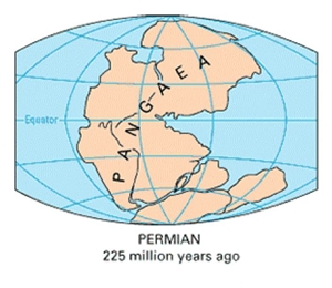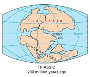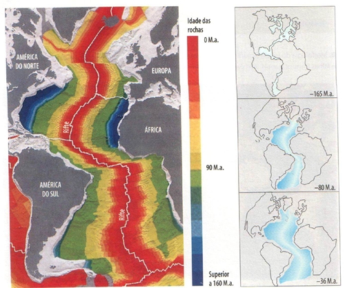 A Pangeia há 180M.a., fragmentou-se, originando dois continentes, a Laurásia e a Gonduana, que há 70M.a., começaram a afastar-se.