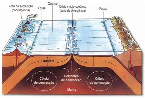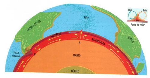 Nas zonas onde ascendem as correntes de convecção (A) as placas sofrem afastamento (divergência), enquanto que nas zonas onde as correntes de convecção têm movimentos descendentes (B) as placas aproximam-se (convergência).