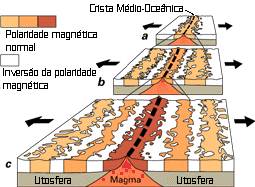 Fig.–Geomagnetismo do fundo oceânico. a.A crista médio-oceânicae a banda magnética à 5M.a. b.Há 2 a 3 M.a. c.Actualmente