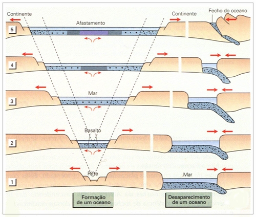 Fig. -Representação esquemática da ideia proposta por Carey Formação e desaparecimento de um oceano