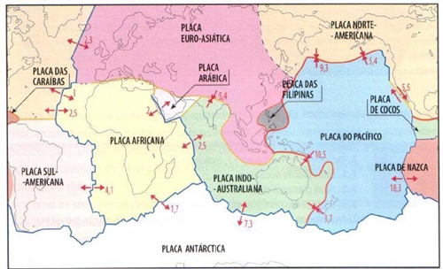 O fundo oceânico está em constante formação e expansão a partir dos riftes, onde o magma ascende. A saída de lava através dos riftes provoca a expansão dos fundos oceânicos, expansão essa que conduz ao afastamento dos continentes. A corrente ascendente faz com que o magma ao ascender à superfície, nos riftes, empurre as rochas pré-existentes e solidifique, formando nova crosta basáltica. Assim essa força conjugada com os movimentos de materiais que se encontram por baixo da litosfera, na astenosfera, faz com que se dê o afastamento dos continentes. À medida que o novo fundo de oceano se produz, o mais antigo, o mais próximo das margens continentais, mergulha e derrete-se nas fossas oceânicas. Teoria da Tectónica de Placas A litosfera não é contínua estando dividida em vastas porções, denominada placas litosféricas, que deslizam sobre uma camada plástica (astenosfera), por acção de correntes de convecção. Os limites das placas podem não coincidir com os limites dos continentes. Algumas delas são unicamente oceânicas, como a Placa do Pacifico, e outras são mistas, com parte de litosfera oceânica e parte continental, como a Placa Africana. Os continentes são partes emersas de certas placas.