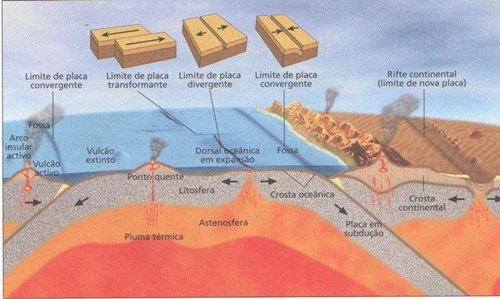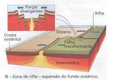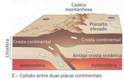Se as duas placas que colidem são continentais, formam-se cadeias de montanhas que podem estar associadas a fenómenos vulcânicos. Limites divergentes: situam-se nas dorsais oceânicas e são zonas onde é gerada nova crosta. Geralmente as dorsais têm um vale central chamado rifte, onde há ascensão de material.