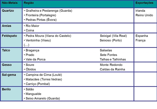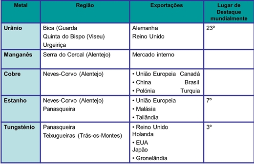 Actividade Mineira actual em Portugal Já passaram os tempos em que não havia praticamente um concelho onde não existisse uma ou mais minas, hoje em dia a indústria extractiva nacional tem em média uma dúzia de minérios entre metálicos e não metálicos.