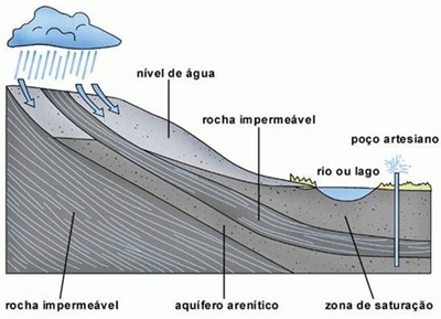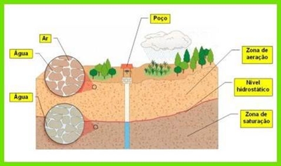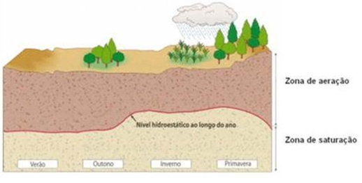 Um bom aquífero é, simultaneamente, poroso e permeável, o que lhe permite armazenar e libertar a água. São exemplos de bons aquíferos, as areias, os cascalhos, os arenitos, os conglomerados e os calcários fracturados. Zonas de um aquífero Zona de aeração: localiza-se entre a superfície do terreno e o nível hidrostático. Nesta zona, os poros entre as partículas do solo ou da rocha são ocupados por água e por ar. Zona de saturação: tem como limite superior o nível hidrostático. Nesta zona todos os poros da rocha estão completamente preenchidos por água. Zonas de um aquífero Nível hidrostático ou freático: é a profundidade a partir da qual aparece a água. Este nível é variável de região para região e na mesma região varia ao longo do ano.